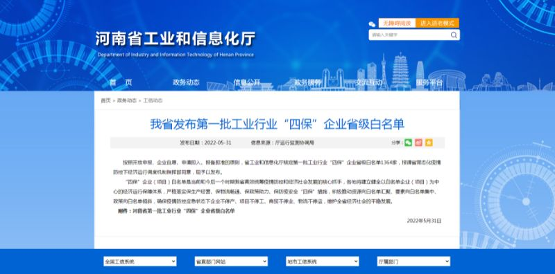 河南省第一批工業行(háng)業“四(sì)保”企業(yè)省級白名單