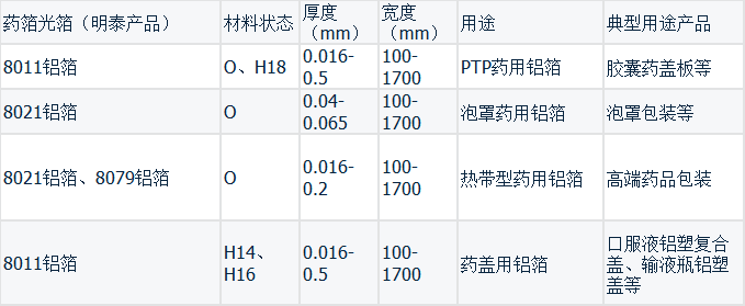 | 藥箔光箔(明泰(tài)產品) | 材料狀態 | 厚度(mm) | 寬度(mm) | 用途 | 典型用途產(chǎn)品 |